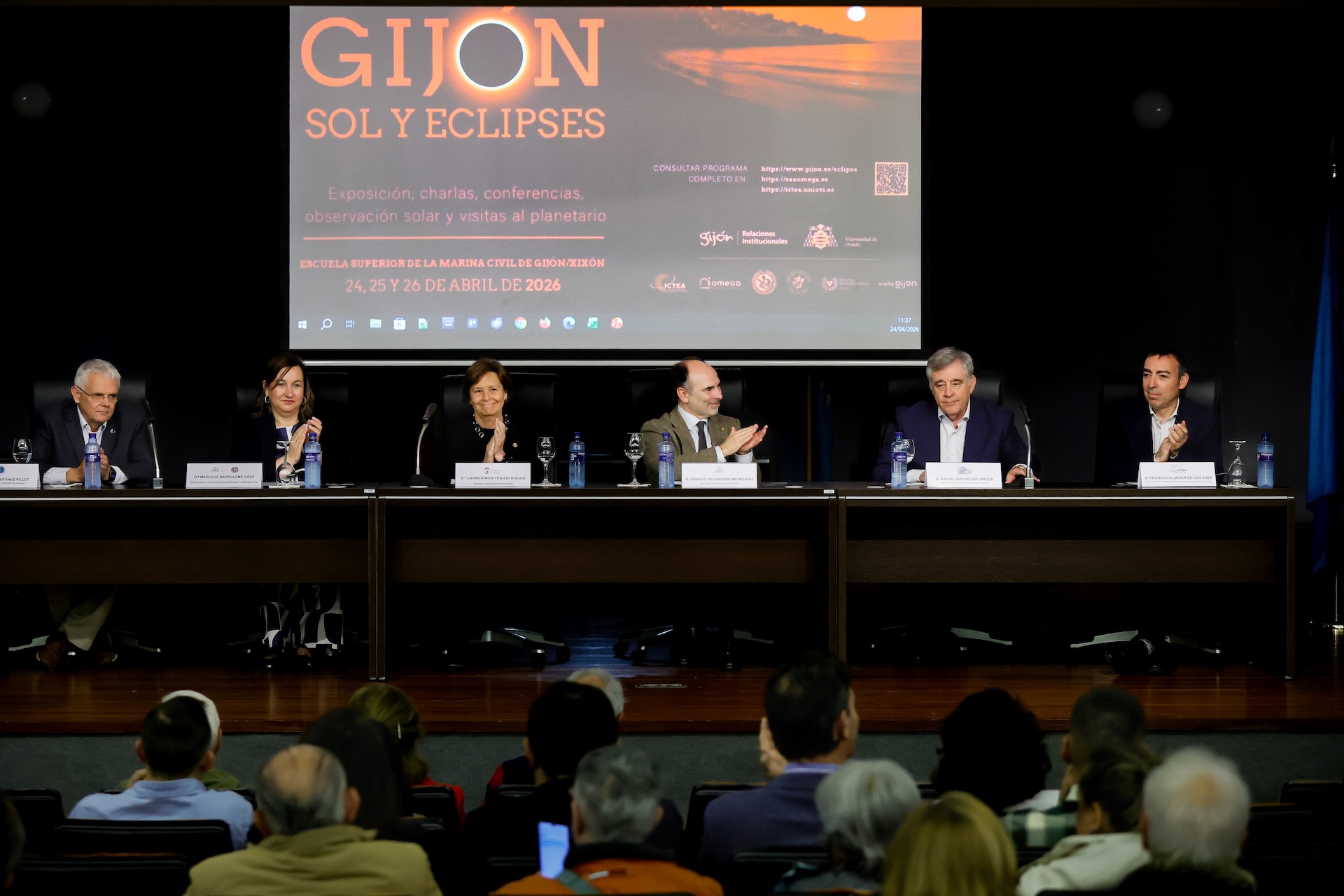 2026.04.24 (Gijón).- La alcaldesa de Gijón, Carmen Moriyón, inauguró este viernes las II Jornadas ‘Gijón, sol y eclipses’, un encuentro que se celebra hasta el 26 de abril en la Escuela Superior de Marina Civil como parte del dispositivo de preparación ante el eclipse solar total del próximo 12 de agosto. Durante su intervención, Moriyón subrayó el carácter excepcional de este fenómeno, que convertirá a Gijón en uno de los puntos privilegiados para su observación. “El próximo 12 de agosto Gijón será uno de esos lugares privilegiados para vivir de cerca un eclipse solar total, un fenómeno que no se observaba en la Península Ibérica desde 1912”, señaló.